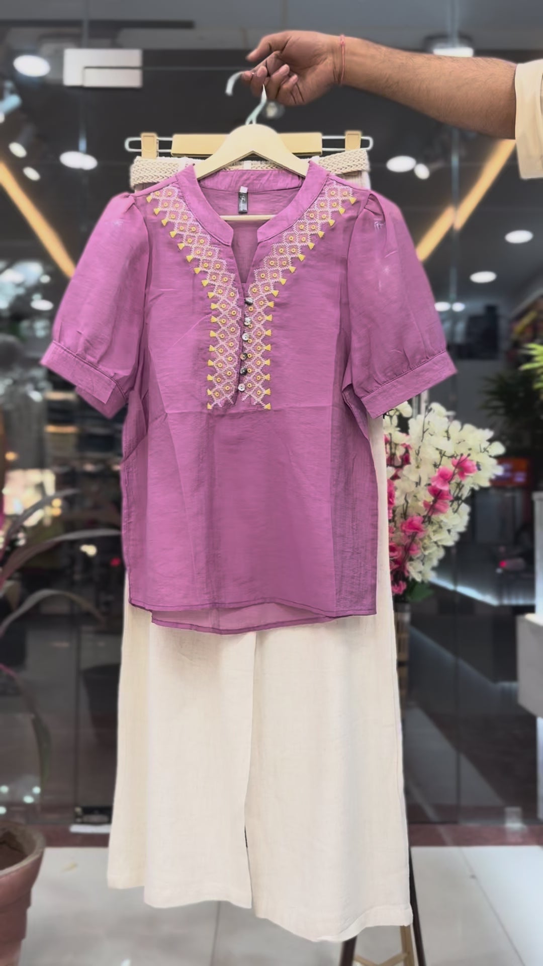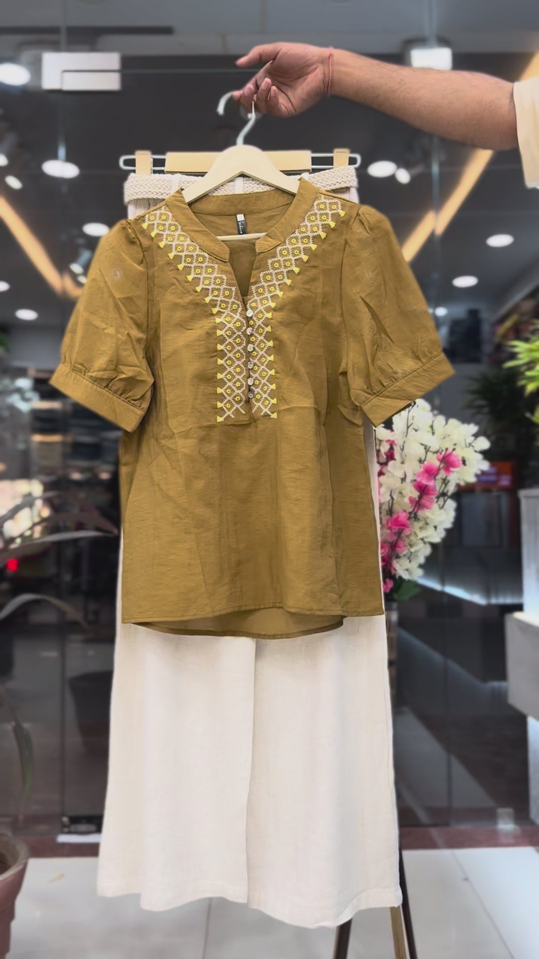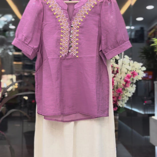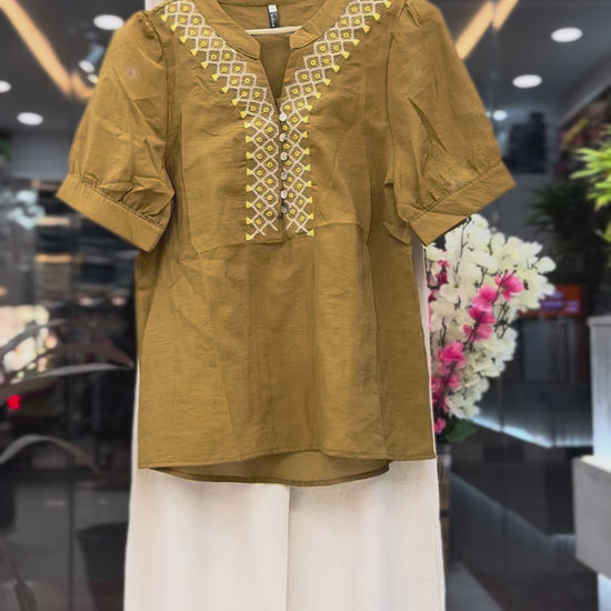 * The Top: A premium short tunic featuring a V-neckline with detailed geometric embroidery and decorative buttons. The puff sleeves give it a modern, chic look. Available in two stunning shades: Onion Pink and Mustard Gold.
