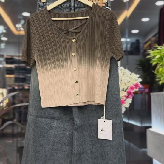 * The Top: This short-sleeved ribbed knit top features a striking brown-to-beige ombre (gradient) effect. It includes a decorative criss-cross neckline detail and gold-tone front buttons for a chic touch.